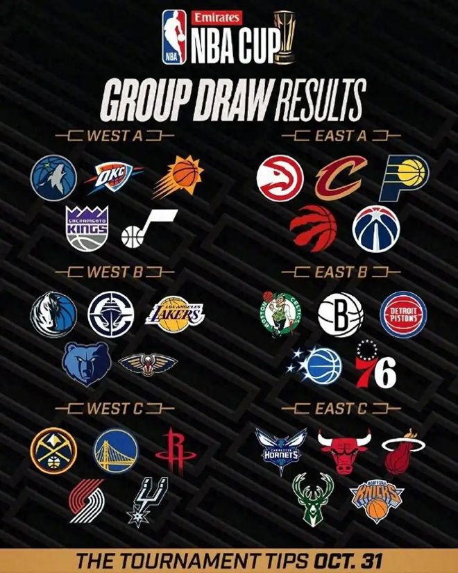 NBA杯的晉級(jí)規(guī)則是,西部3個(gè)小組的小組第1,和1個(gè)戰(zhàn)績(jī)最好的小組第2晉級(jí)半決賽。