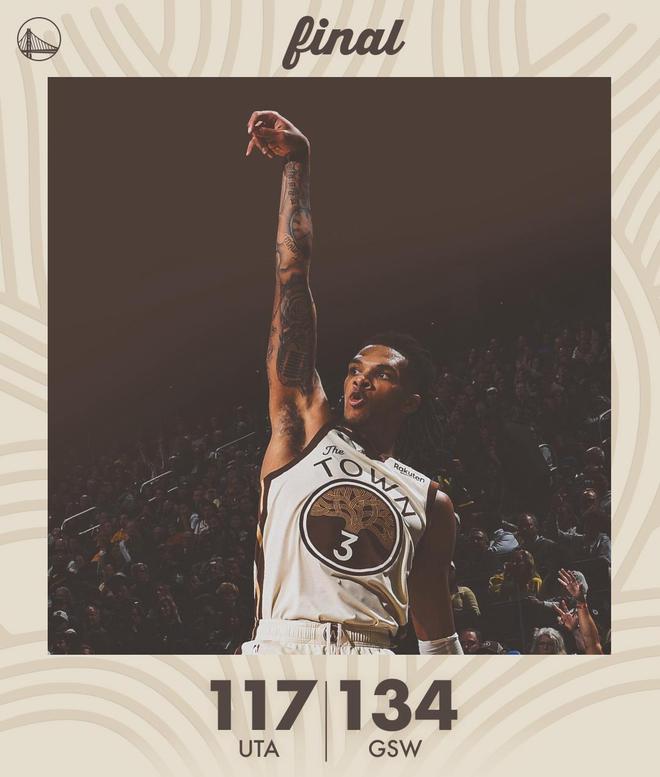 庫(kù)里搶斷馬爾卡寧,希爾德失誤,貝利反擊暴扣。喬治上籃得分,佩頓、貝利對(duì)轟遠(yuǎn)投。馬爾卡寧2罰1中,穆迪暴扣。喬治命中2+0,希爾德回敬三分球,距離終場(chǎng)不足4分鐘之際,勇士領(lǐng)先24分鎖定勝局??茽枔Q下庫(kù)里等首發(fā),兩隊(duì)開始在場(chǎng)上練兵,時(shí)間逐漸走完。最終,勇士以134比117完勝爵士。
