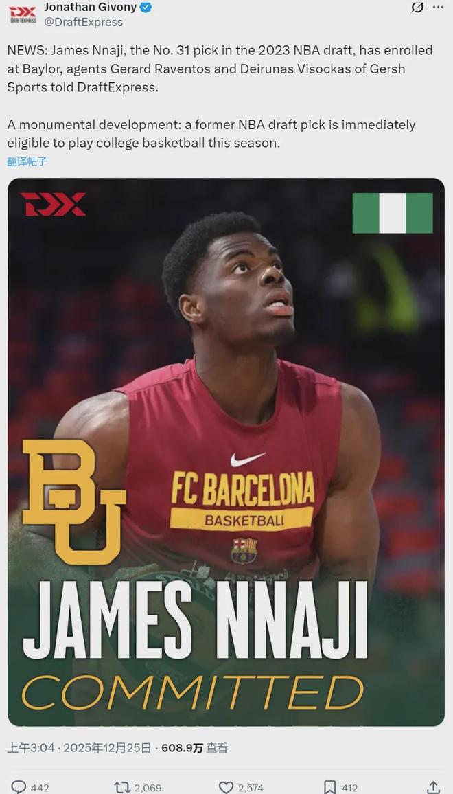 北京時間12月25日,據(jù)NBA選秀專家Jonathan Givony報道,2023屆NBA的31號秀詹姆斯-納吉加盟貝勒大學,已經(jīng)完成注冊,他將參加本賽季NCAA比賽。另一個選秀記者Joe Tipton透露,納吉獲得