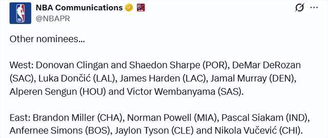西部:克林根和夏普(開拓者)、德羅贊(國王)、東契奇(湖人)、哈登(快船)、穆雷(掘金)、申京(火箭)、文班亞馬(馬刺)