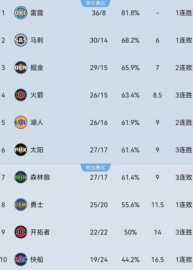 隨著主場(chǎng)111-106險(xiǎn)勝馬刺,火箭豪取三連勝,目前以26勝15負(fù)排名西部第四,湖人則以26勝16負(fù)緊隨其后。