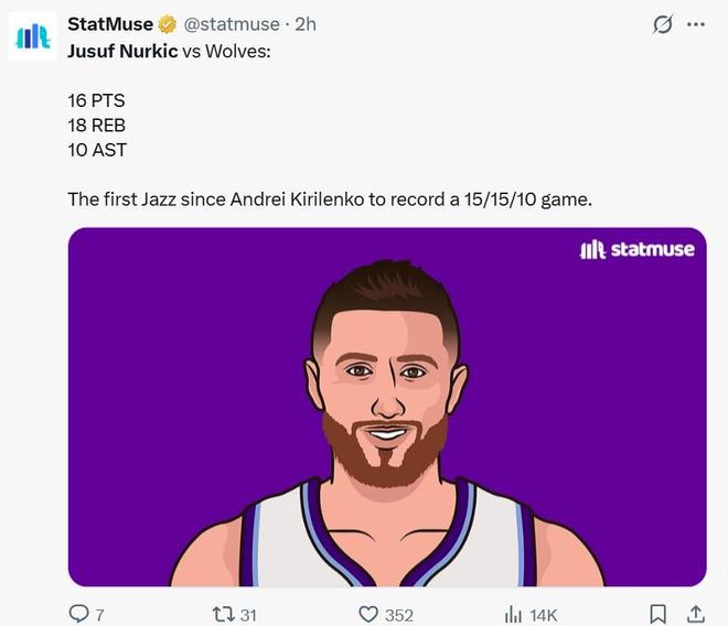 除了兩大新星之外,爵士隊之所以能夠完成爆冷也與內(nèi)線老將努爾基奇的爆發(fā)有關(guān),本場努爾基奇11中7爆砍16分18板10助三雙數(shù)據(jù),外加1斷1帽。