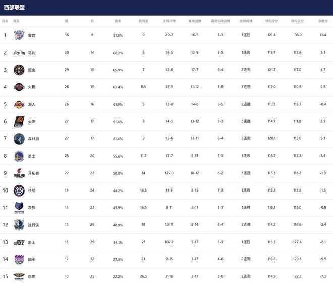 1-3名:雷霆(36勝8負)、馬刺(30勝14負)、掘金(29勝15負)