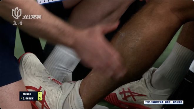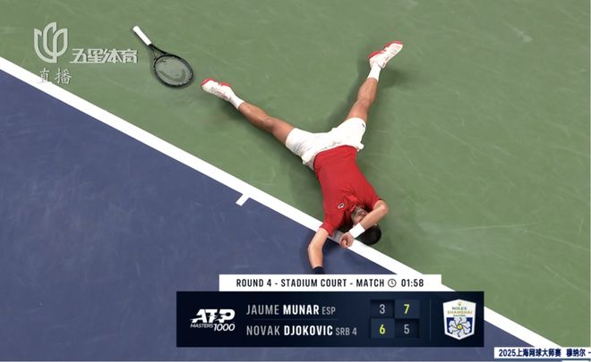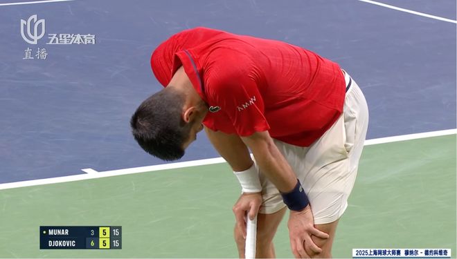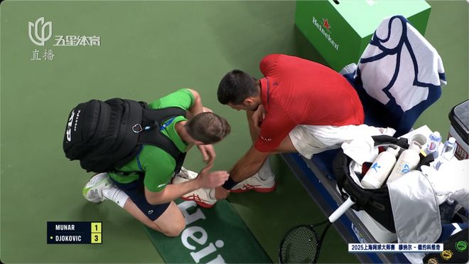 第二盤前11局,雙方互相保發(fā),來到德約非保不可的發(fā)球局,德約被穆納爾破發(fā)的瞬間,這位38歲的老將無奈躺在了地上。盤間休息,理療師上前為德約開始量血壓……雙方大比分來到1比1,對于德約而言,再打一盤簡直是噩夢……