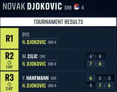 前兩輪,德約科維奇分別戰(zhàn)勝克羅地亞老將西里奇以及德國選手漢夫曼,但兩場比賽加起來耗時接近5個小時,體能對于38歲的德約來說是個不小的考驗。
