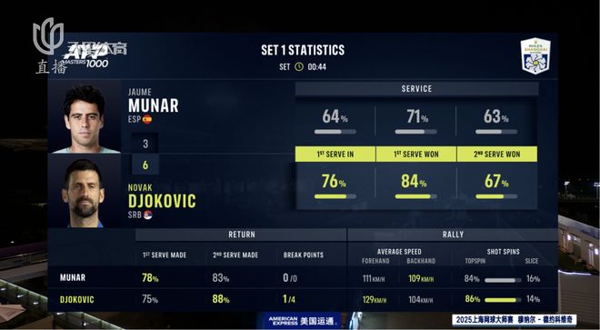 而在自己的接發(fā)輪,德約科維奇也不想與穆納爾做過多纏斗,主動變線進攻,每一分的回合數(shù)都在三拍左右。首盤6比3,德約耗時50分鐘,1比0取得領(lǐng)先,這一盤中,塞爾維亞名將在自己的發(fā)球局總共就丟了5分。