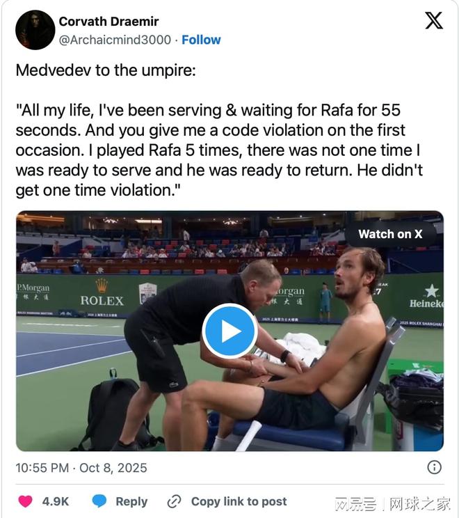 在被判違規(guī)后,梅德韋杰夫當場反擊,提起自己與納達爾交手的往事。他認為納達爾在比賽中總是讓對手等待,但從未因此受到處罰,而他卻在上海第一次就被判違規(guī)。他當面指責主裁“瘋了”,對判罰極為不滿。