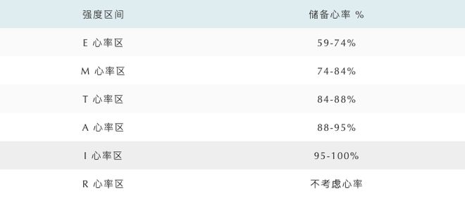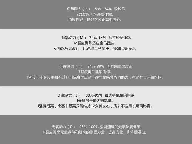 E強(qiáng)度幫你打下扎實(shí)的有氧基礎(chǔ),M強(qiáng)度是跑馬拉松賽事時(shí)的平均配速,T 強(qiáng)度訓(xùn)練能夠有效擴(kuò)展跑者的有氧區(qū)間,A強(qiáng)度是T到I之間的無(wú)氧過(guò)渡區(qū),I強(qiáng)度是為了刺激最大攝氧量的配速,R強(qiáng)度是在提升跑步的經(jīng)濟(jì)性。