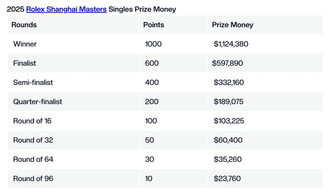 2025勞力士大師賽獎(jiǎng)金。來源:ATP TOUR 官網(wǎng)