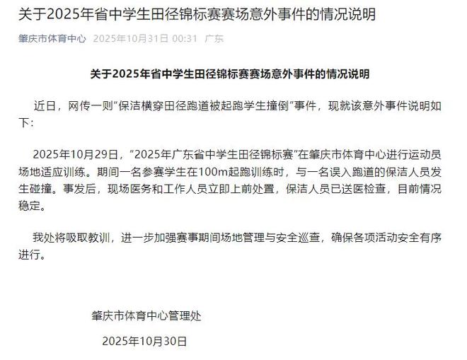 新京報訊 肇慶市體育中心管理處10月30日發(fā)布《關(guān)于2025年省中學(xué)生田徑錦標(biāo)賽賽場意外事件的情況說明》: