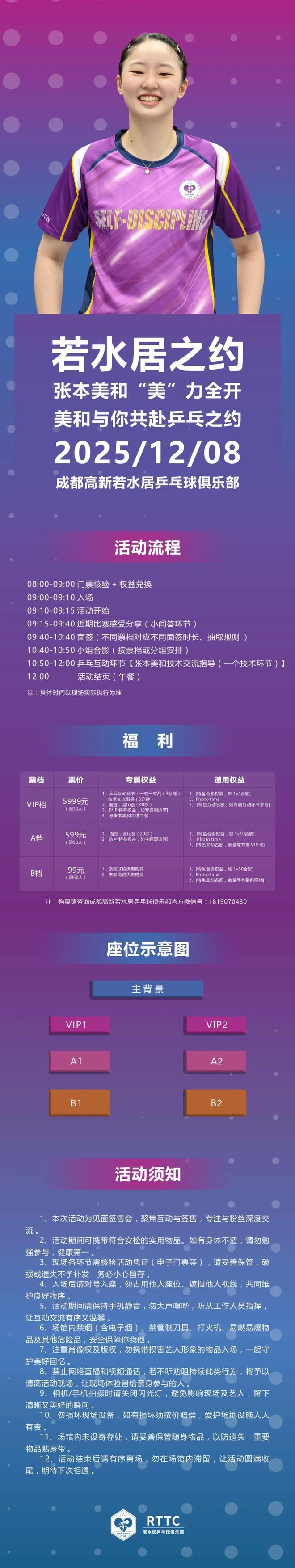 11月11日,據(jù)成都高新若水居乒乓球俱樂部微信公眾號官方消息,日本乒乓球名將張本美和將于成都舉辦線下見面會,VIP票價(jià)5999。