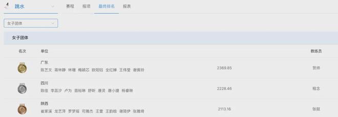 11月2日,在第十五屆全運會跳水項目女子團體比賽中,全紅嬋搭檔王偉瑩出戰(zhàn)女團雙人10米臺,3跳穩(wěn)定發(fā)揮,以235.86的總成績排名第一,幫助廣東隊女團奪金。