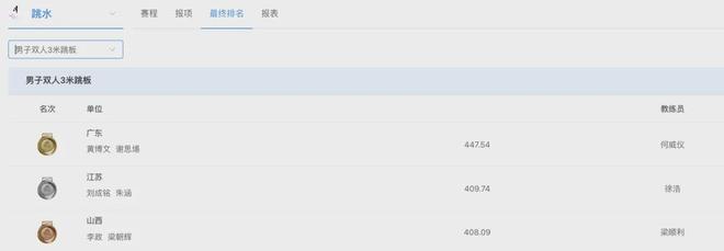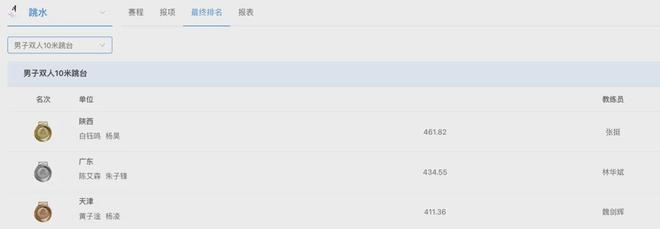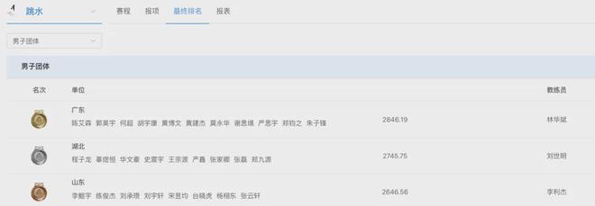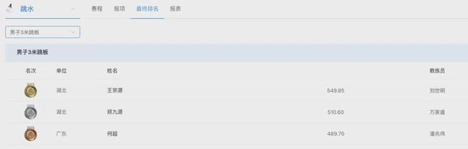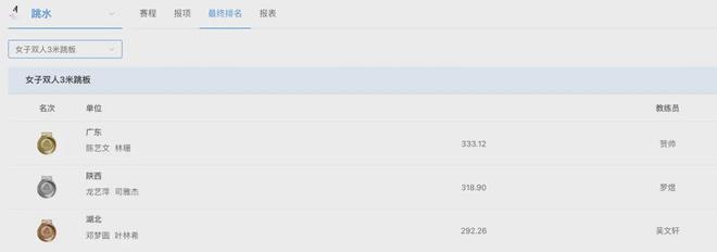 11月11日,十五運會跳水賽事圓滿落幕。廣東隊收獲6金1銀2銅,成為跳水項目金牌收獲最多的隊伍。男子團體金牌↓↓女子團體金牌↓↓男子雙人3米跳板黃博文/謝思埸金牌↓↓女子雙
