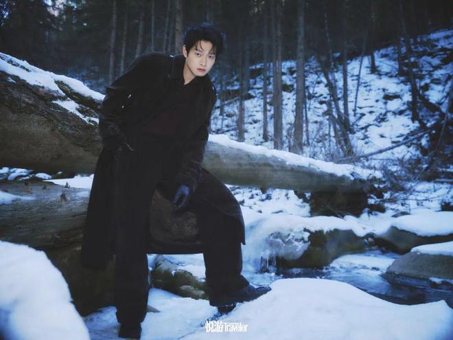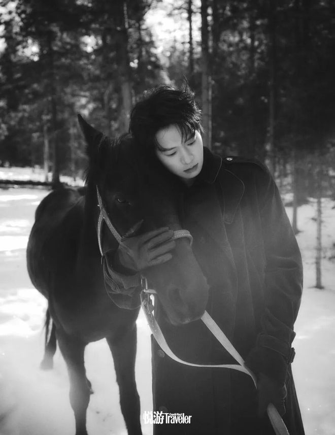 車輛在一處門形的山腳停下。往下是陡坡,遍布大小碎石,上方覆著不知深淺的雪。魏大勛一身黑衣黑褲,一腳踏進坡下的林間雪原里。白樺、雪松,曠野里格外清冽的空氣,冰層下的汩汩溪流,眼前一切都讓身為東北人的他熟悉而親近。鏡頭對準了橫亙在溪流上的一截枯木,他輕快地走過去,斜斜地倚著,目光在枯葉、松針、樹影光斑間逡巡,最后定格在一匹悄然現(xiàn)身的黑色駿馬上。