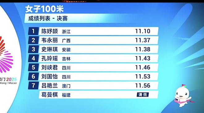 憑借強(qiáng)有力的后程發(fā)力沖刺,16歲的陳妤頡以11秒10奪得了2025粵港澳全運(yùn)會(huì)女子100米決賽冠軍,她刷新了個(gè)人最好成績,還刷新了亞洲青年紀(jì)錄,并且成為全運(yùn)會(huì)歷史上最年輕的百米冠軍(1