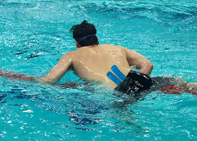 第二幀:奪冠后,汪順準備跨上水線向現(xiàn)場觀眾示意,他腰上貼著的兩條厚肌貼十分明顯。