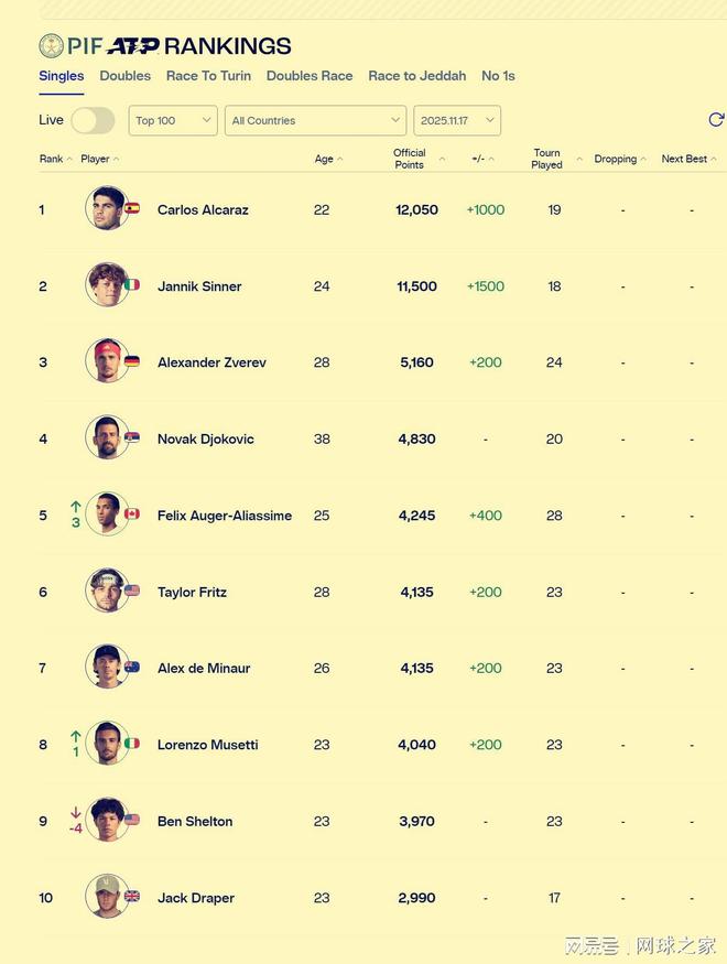 其中,在都靈打進(jìn)半決賽的加拿大名將阿利亞西姆首次躋身TOP5,創(chuàng)下職業(yè)生涯新高。而弗里茨則因為同胞謝爾頓年終總決賽三戰(zhàn)皆負(fù)小組賽墊底,得以重返美國一哥的位子。