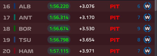 Q2上來皮亞斯特里一度刷紫,不過隨著賽道變干,勞森和哈賈爾先后來到榜首,諾里斯也反超皮亞斯特里來到第三的位置。Q2結(jié)束時,拉塞爾沖到第一位,皮亞斯特里險些被淘汰。被淘汰的是霍肯伯格、奧康、比爾曼、克拉平托以及用半雨胎跑了4圈的斯特羅爾。