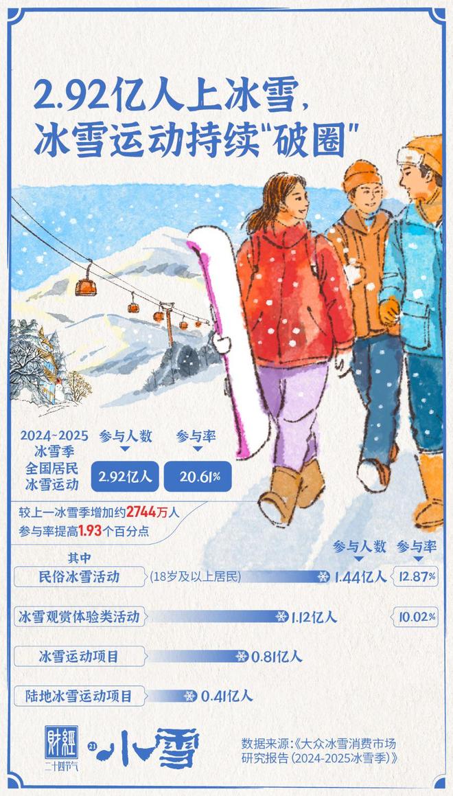 小雪已至,朔風(fēng)催雪,冰雪經(jīng)濟(jì)市場(chǎng)活力涌動(dòng)。第十五屆全國運(yùn)動(dòng)會(huì)的舉辦點(diǎn)燃了全民運(yùn)動(dòng)熱情,體育活力持續(xù)釋放,冰雪運(yùn)動(dòng)從專業(yè)賽場(chǎng)走向大眾生活,成為越來越多人的冬季消費(fèi)選擇?!洞蟊姳┫M(fèi)市場(chǎng)研究報(bào)告(2024—2025冰雪季)》顯示,2024—2025年冰雪季期間,全國居民參加冰雪運(yùn)動(dòng)人數(shù)達(dá)2.92億人,參與率為20.61%,冰雪經(jīng)濟(jì)的熱度正持續(xù)攀升。
