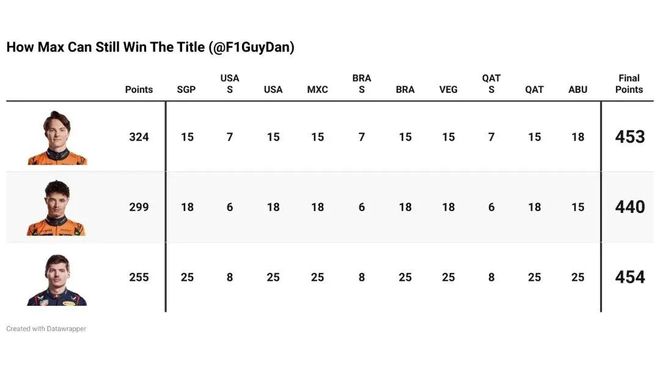 誰都沒有想到,在本賽季還剩最后兩輪的情況下,維斯塔潘能把自己和頭名的分?jǐn)?shù)追回到24分。