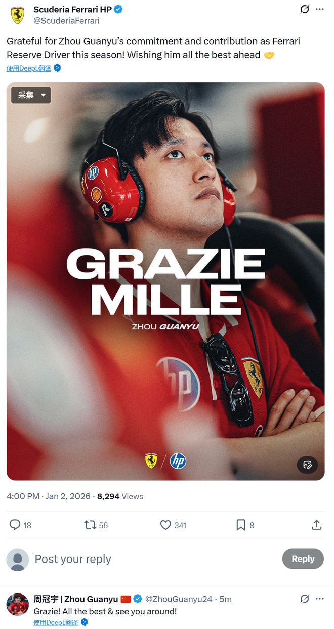 北京時(shí)間1月2日下午,法拉利F1車隊(duì)在其官方社媒發(fā)文,感謝周冠宇過去一年作為替補(bǔ)車手的付出,祝愿他未來順利。周冠宇在其下留言道:“謝謝!祝一切順利,下次見!” 2025年2月,周冠宇正