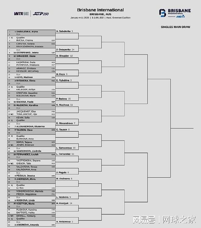 WTA500布里斯班站則是星光熠熠,多位TOP10球員出戰(zhàn)。前八大種子的對位:上半?yún)^(qū),薩巴倫卡--凱斯、萊巴金娜--亞歷山德洛娃;下半?yún)^(qū),陶森--佩古拉、米拉-安德列娃--阿尼西莫娃。雙打方面:中國有四朵金花出戰(zhàn),其中張帥/薩姆索諾娃首輪迎戰(zhàn)巴多薩/薩巴倫卡;蔣欣玗/詹皓晴對陣亞歷山德洛娃/米拉-安德列娃;謝淑薇/奧斯塔彭科迎戰(zhàn)蓋德基/米哈利科娃。