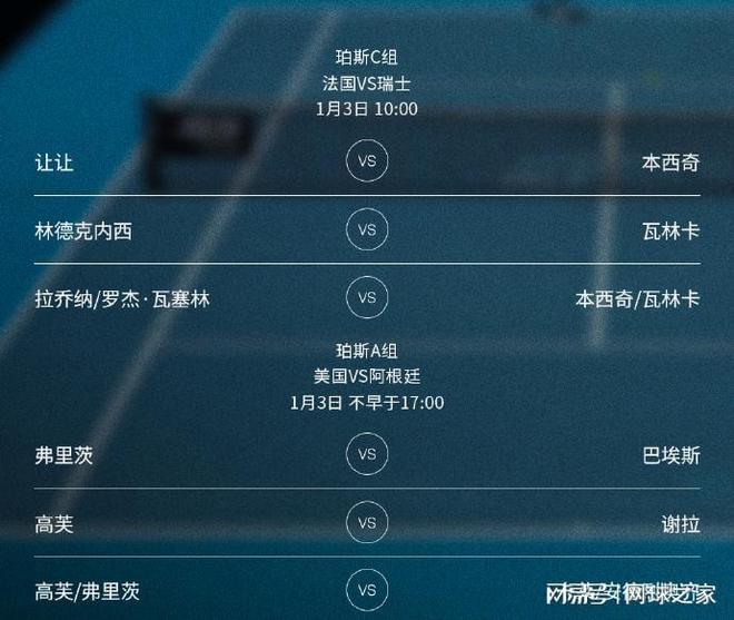 珀斯賽區(qū)的法國隊與瑞士隊的較量在北京時間今天上午10點打響,雙方的對陣是:讓讓 vs 本西奇、林德克內(nèi)西 vs 瓦林卡、拉喬納/羅杰-瓦塞林 vs 本西奇/瓦林卡。截至發(fā)稿時,瑞士隊依靠本西奇兩盤獲勝,取得1-0的領(lǐng)先。 北京時間今天下午2點半和5點時段,還有澳大利亞vs 挪威和美國vs 阿根廷兩場較量,其中小野兔對決魯?shù)隆⒏ダ锎腜K巴埃斯、高芙對陣謝拉等場次引人關(guān)注。