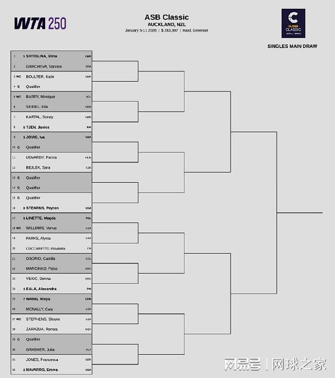 WTA250奧克蘭站:烏克蘭小白菜斯維托麗娜和美國人納瓦羅領(lǐng)銜出戰(zhàn);中國二姐王欣瑜被抽到了下半?yún)^(qū),首輪對陣美國人麥克納莉;大威廉姆斯也確認參賽,首秀的對手是波蘭人里內(nèi)特。另外,在奧克蘭站女單資格賽首輪較量中,中國小將郭涵煜以4-6 0-6吞蛋不敵赫瓦林斯卡,無緣晉級。