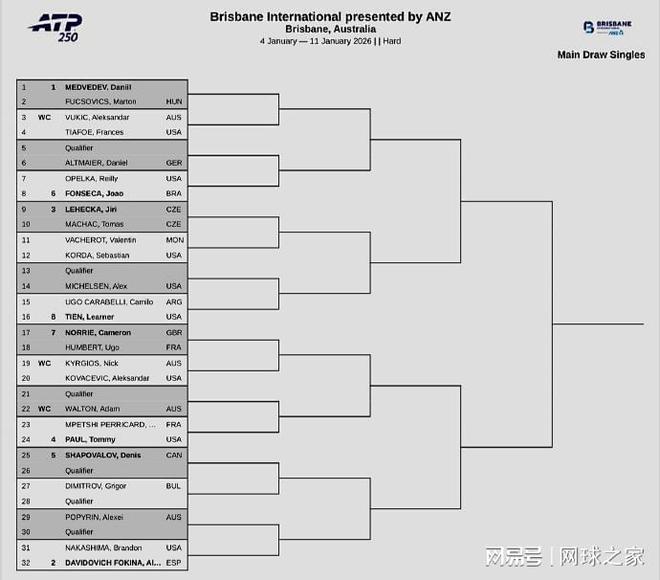 我們再來關(guān)注賽事簽表。北京時間昨晚,下周開打的三站賽事相繼公布了正賽簽表。其中,ATP250布里斯班站由俄羅斯名將梅德維德夫領(lǐng)銜,西班牙人弗基納、捷克人萊赫卡和美國人保羅分列2-4號種子;沙波瓦洛夫、豐塞卡等人也將參賽,澳大利亞壞小子克耶高斯持外卡在本站復出,首輪對陣美國人科瓦切維奇;梅總和椰子分處上下半?yún)^(qū),如想交手,必須各自打進決賽。