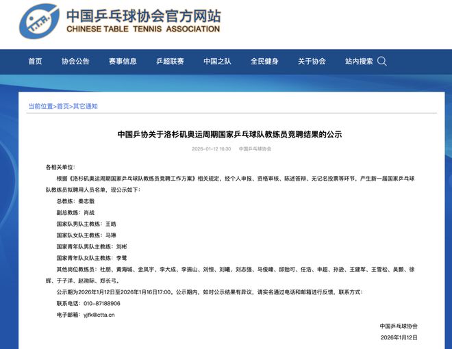 2025年12月20日,中國乒乓球協(xié)會曾在官網(wǎng)發(fā)布《中國乒乓球協(xié)會關(guān)于舉行洛杉磯奧運周期國家乒乓球隊教練員競聘的通知》,正式啟動新周期國家隊教練員公開競聘工作,完成洛杉磯奧運周期備戰(zhàn)任務(wù)。