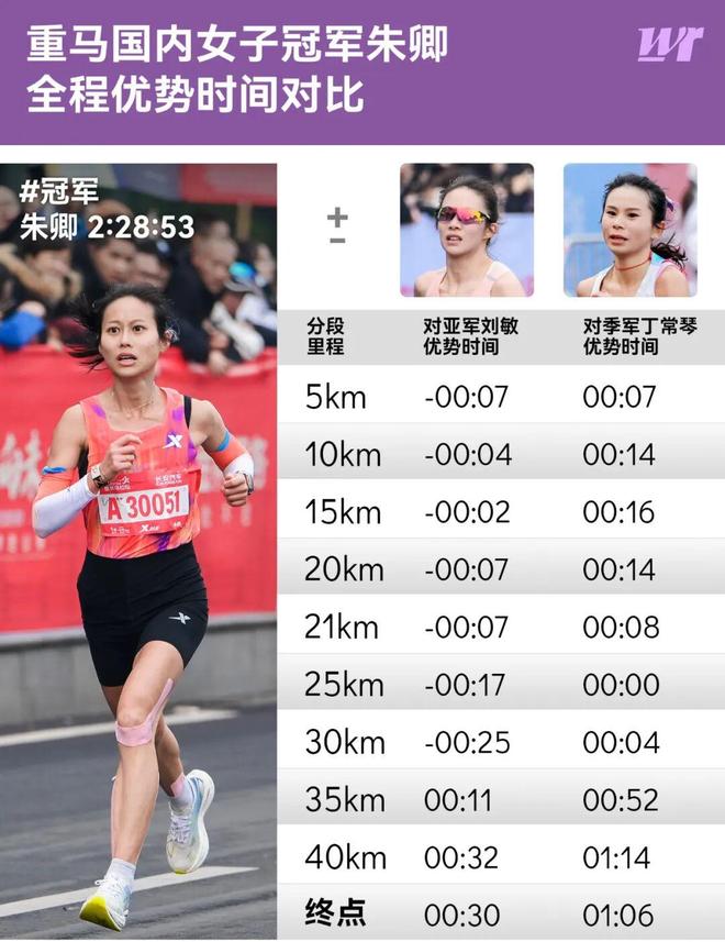 35公里至40公里區(qū)間,朱卿完成了關鍵的反超。盡管賽后朱卿謙虛地表示自己“30公里加速加早了,35.5公里崩掉了,后面是頂回來的”,但她依然展現(xiàn)了極強的后程能力,最終以2:28:53奪得國內(nèi)女子冠軍,不僅大幅刷新個人PB,更以非注冊選手的身份跑出如此成績,強勢重奪“大眾一姐”稱號。劉敏則以2:29:23的成績獲得國內(nèi)亞軍。