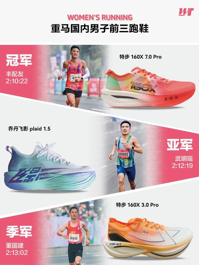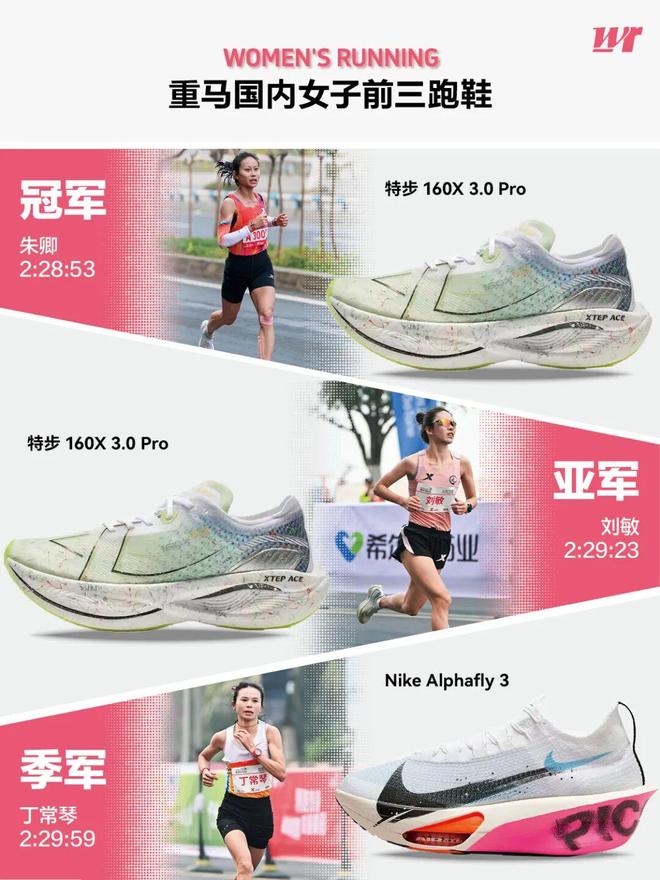作為主贊助商的特步邀請了非常具有實力的簽約運動員。豐配友、董國建、劉敏三人都是全運會主力選手,朱卿和黃菲也是特步簽約運動員中頂級的大眾運動員,還有張水華辭職后的首場全馬也穿上了特步的跑鞋。最終男女國內(nèi)前三中,特步占據(jù)國內(nèi)女子冠亞軍和國內(nèi)男子冠軍和季軍4席,耐克運動員丁常琴獲國內(nèi)女子第三,穿著喬丹的武明瑤獲國內(nèi)男子第二。
