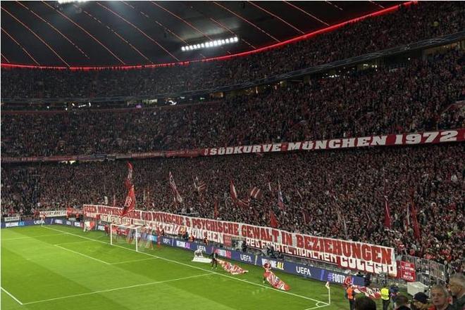 在拜仁對(duì)陣布魯日的比賽開(kāi)賽前不久,安聯(lián)球場(chǎng)的球迷們舉起了一條橫幅,上面寫著“反對(duì)權(quán)力濫用以及在關(guān)系中的身體和心理暴力” 。