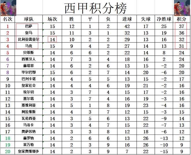 積分榜方面,皇馬連續(xù)踢4個(gè)客場,今天大勝畢爾巴鄂競技止住3連平頹勢,這樣的話他們就還是落后巴薩1分位列第2。比利亞雷亞爾少賽一場,落后皇馬4分仍然排在第3,馬競昨天輸給巴薩,他們就被拉開了分差,已經(jīng)落后皇馬5分,少巴薩6分。