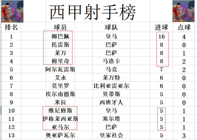 射手榜方面,姆巴佩今天2射1傳獨(dú)造3球,再次擴(kuò)大了領(lǐng)先優(yōu)勢,進(jìn)球數(shù)已經(jīng)是排名第2的萊萬,托雷斯,穆里奇等人的兩倍。阿爾瓦雷斯7球排在第5,維尼修斯今天錯(cuò)失良機(jī)沒有進(jìn)球,還是和亞馬爾,伊格萊西亞斯等人5球剛好擠入前十。