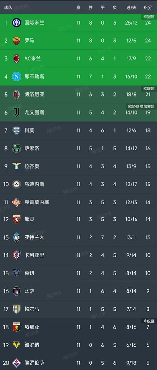 北京時(shí)間11月11日,意甲第11輪結(jié)束了所有比賽,最新積分榜如下!