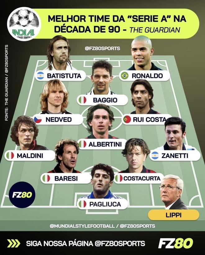 最近《衛(wèi)報》評出了90年代意甲最佳陣容,巴蒂斯圖塔、羅納爾多、巴喬、馬爾蒂尼這些名字全部在列。這套名單幾乎把那一代意甲鋒線、前腰和后防的大牌全都堆在了一起,卻看不到德