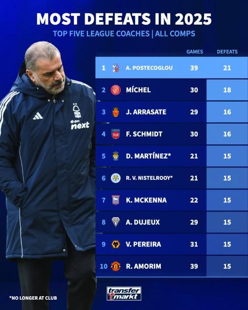 五大聯(lián)賽2025年輸球最多主帥:澳波39戰(zhàn)21負(fù)第1,阿莫林第10