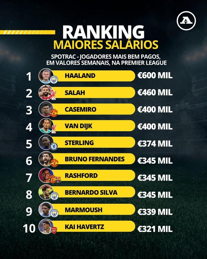 北京時間10月13日,《球報》列出了英超目前周薪最高的前十位球員,哈蘭德60萬歐元居首,薩拉赫、卡塞米羅緊隨其后。