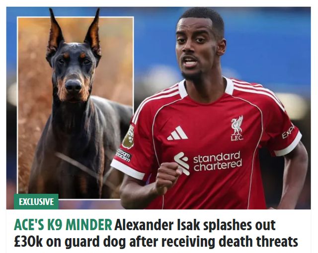 26歲的伊薩克,今年夏天從紐卡加盟利物浦,轉會費高達1.45億歐元(1.3億英鎊),是英超歷史標王。11月22日,英國《太陽報》獨家爆料,遭到死亡威脅的伊薩克,花3萬英鎊買下一只杜賓犬,守衛(wèi)自