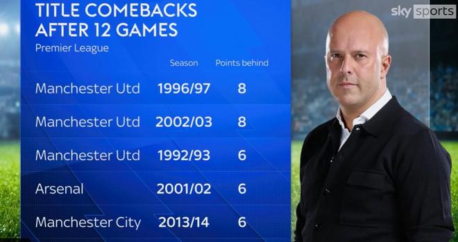 據(jù)《天空體育》的數(shù)據(jù)統(tǒng)計(jì),此前,第12輪落后第一名6分或更多的分還能奪冠的情況,英超歷史只出現(xiàn)過(guò)5次。