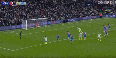 第41分鐘,B席右路回做,努內(nèi)斯斜傳送到禁區(qū)后點(diǎn),哈蘭德拍馬趕到頭球攻門得手,曼城1-0水晶宮。
