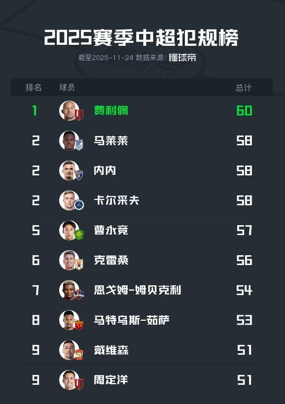 11月22日,2025賽季中超聯(lián)賽落下戰(zhàn)幕。根據(jù)懂球帝統(tǒng)計(jì)的2025賽季中超球員犯規(guī)榜:成都蓉城隊(duì)費(fèi)利佩以60次排在首位;大連英博隊(duì)馬萊萊、云南玉昆隊(duì)內(nèi)內(nèi)、深圳新鵬城隊(duì)卡爾采夫并列