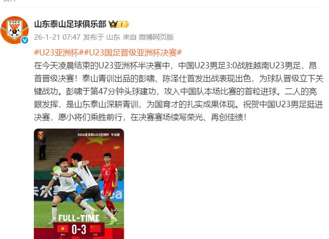 山東泰山官方對(duì)兩位小將的表現(xiàn)予以肯定:“泰山青訓(xùn)出品的彭嘯、陳澤仕首發(fā)出戰(zhàn)表現(xiàn)出色,為球隊(duì)晉級(jí)立下關(guān)鍵戰(zhàn)功。彭嘯于第47分鐘頭球建功,攻入中國隊(duì)本場(chǎng)比賽的首粒進(jìn)球。二人的亮眼發(fā)揮,是山東泰山深耕青訓(xùn)、為國育才的扎實(shí)成果體現(xiàn)。祝賀中國U23男足挺進(jìn)決賽,愿小將們乘勝前行,在決賽賽場(chǎng)續(xù)寫榮光、再創(chuàng)佳績!”